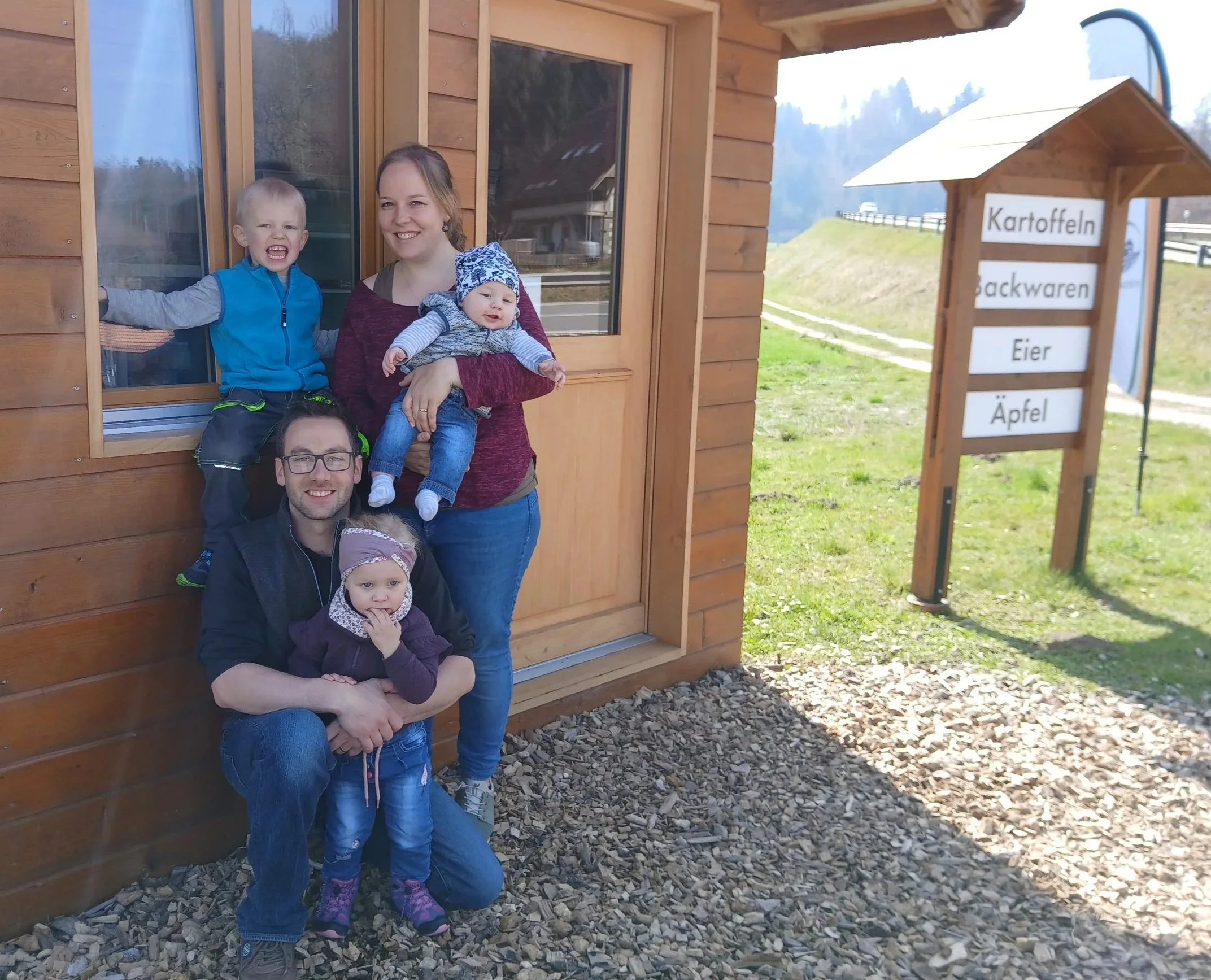 Wir sind Familie Schertenleib und wohnen im Stockacker Wynigen, der nur ein paar hundert Meter vom Hofladen entfernt liegt.Simon ist gelernter Polymechaniker und Landwirt. Er arbeitet zur Zeit als Landwirt und teilzeit Melktechniker. Zu seinen Hobbys zählen unter anderem das musizieren in einer Brassband.Mit seiner Frau Milena übernahm er Anfang 2023 den elterlichen Landwirtschaftsbetrieb. Der Betrieb beinhaltet Ackerbau, Futterbau, Aufzucht von Kälber für die Grossviehmast und Gemüseanbau.Milena ist gelernte Bäcker- Konditorin- Confiseurin und arbeitet Teilzeit auswärts. Dieses Handwerk kann sie auch auf dem Hof ausleben und beliefert den Hofladen mit diversen Produkten. Auch sie spielt in einem Posaunenchor ein Instrument.Zur Familie gehören Elias 2022, Ladina 2024 und David 2025